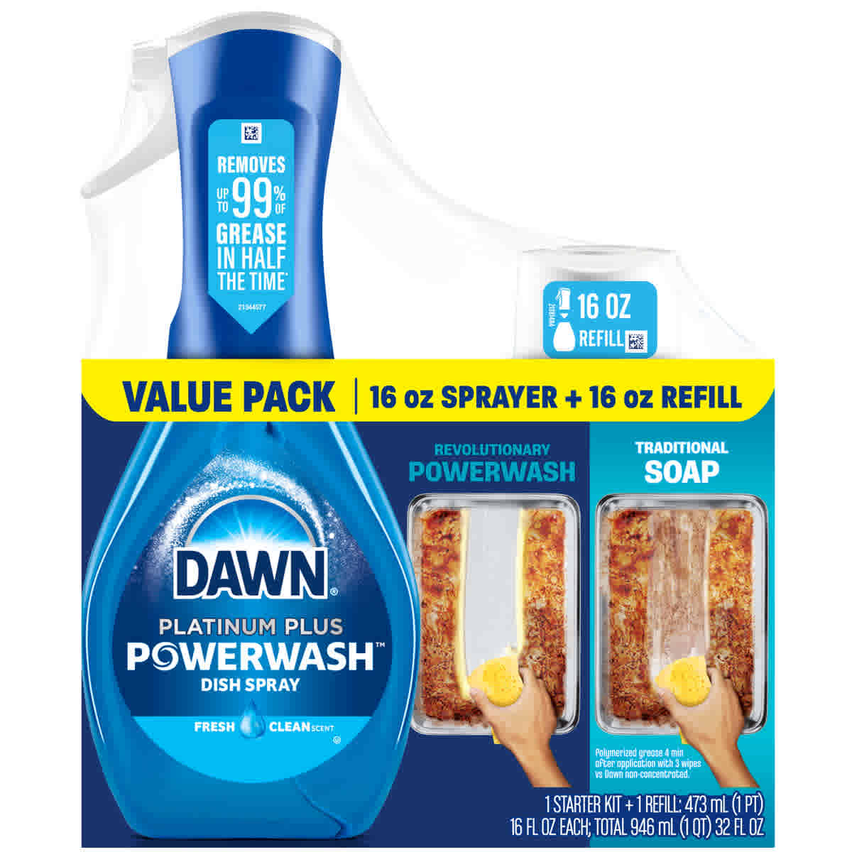 Dawn Powerwash Dish Spray removes 99% of grease and grime in half the time*. Powerwash has 3 cleaning boosters not found in traditional dish soaps that remove food and grease 5X faster*. And because it cleans so well, you can replace multiple cleaning products around your home for counters, stoves, grills, and stains on laundry. Powerwash delivers the power of an overnight soak in minutes. For everyday messes, just spray the suds on and wipe, no water needed until rinsing. For tougher messes, let the suds sit a few minutes before wiping. Save money and reduce waste by reusing your sprayer. Convenient refills available in a variety of scents.